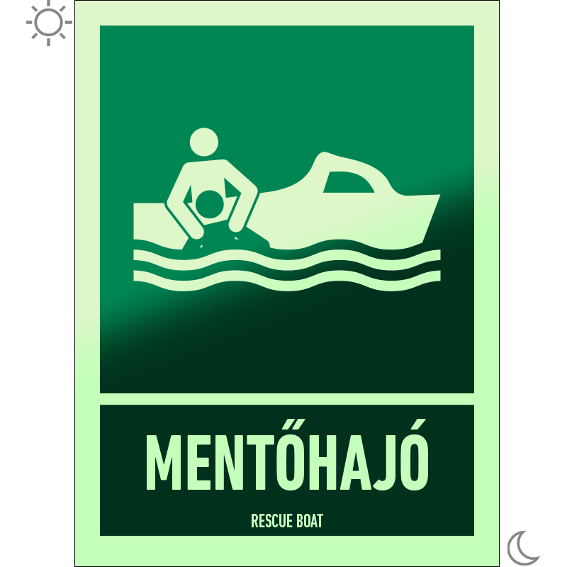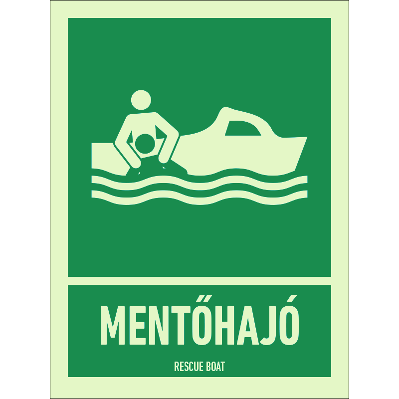 A “Mentőhajó” a hajón található mentőhajó helyét jelző zöld alapon fehér piktogram.