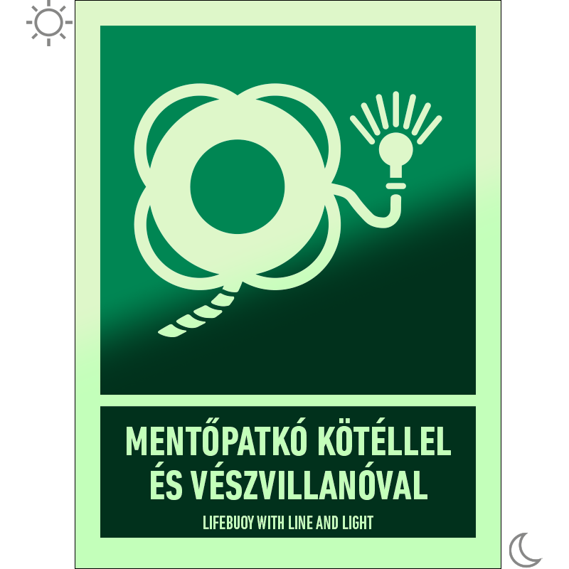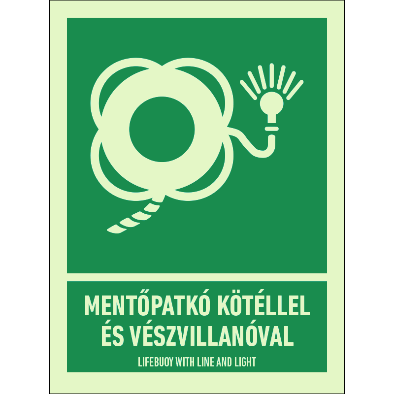A “Mentőpatkó kötéllel és vészvillanóval” a hajón található kötéllel és vészvillanóval ellátott mentőpatkó helyét jelző zöld alapon fehér piktogram.