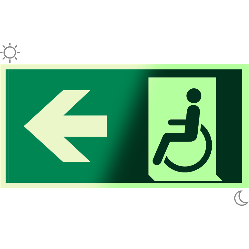 | Mozgásukban korlátozott személyek számára mentési/menekülési út balra utánvilágító matrica (ISO 7010-E026 piktogram) 300x150 mm MET104001UTV03000150 | utánvilágító öntapadó | 300 mm | 150 mm | 0.5 mm | db | 2175 Ft | 2762 Ft |