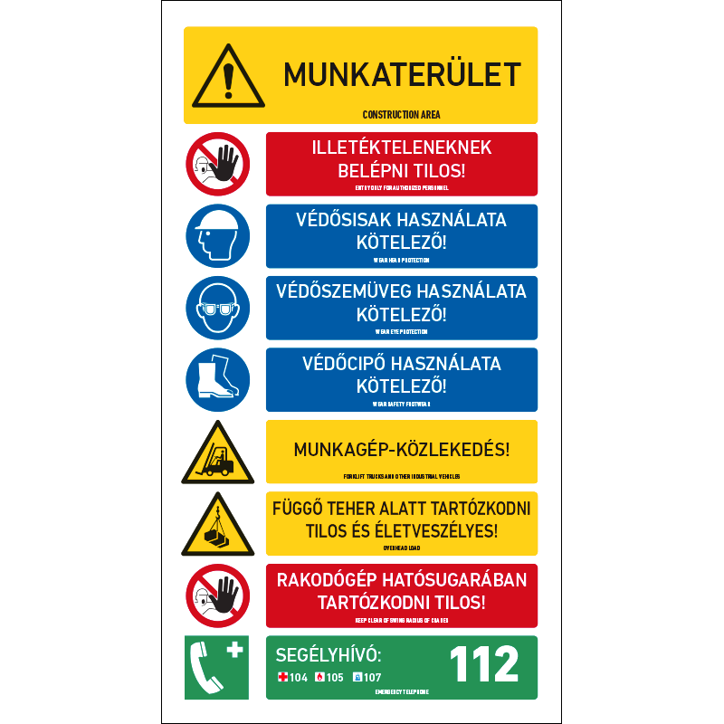 A “Munkaterület összegző tábla” a biztonság és egészség védelmére vonatkozik: a veszélyekre és a betratandó biztonsági intézkedésekre figyelmeztet.