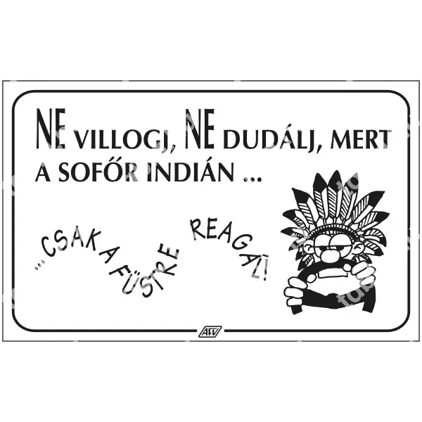 | Ne villogj, ne dudálj, mert a sofőr indián … tábla 160x100 mm DEB021001PVC01600100 | PVC 1 mm | 160 mm | 100 mm | 1 mm | db | 625 Ft | 794 Ft |