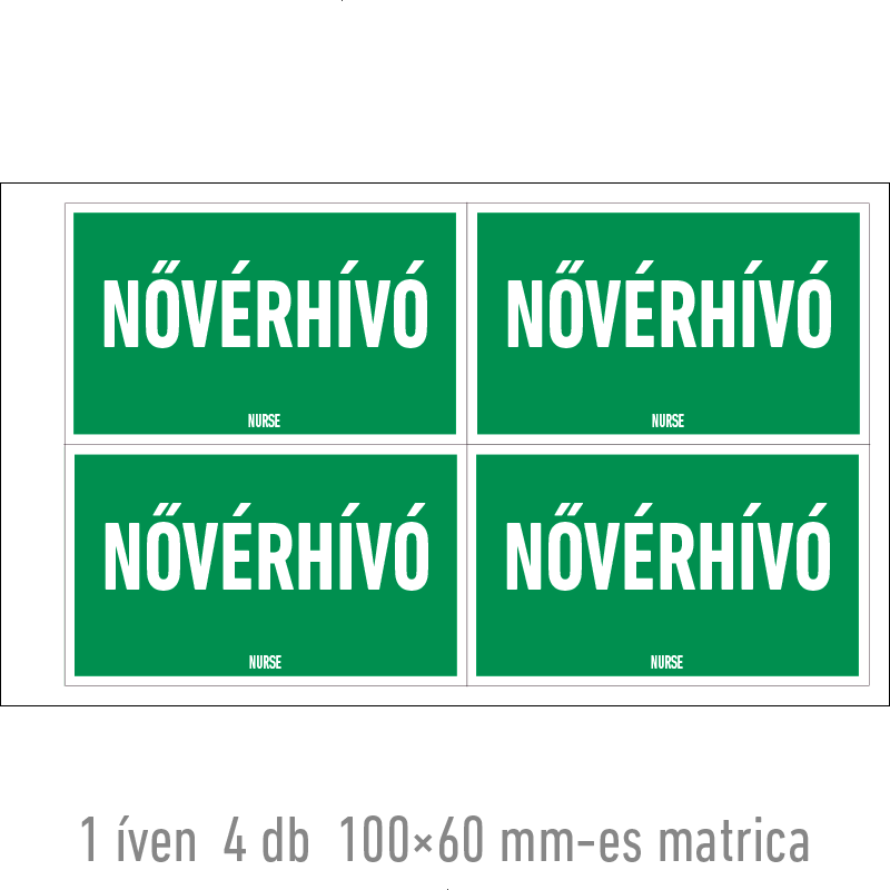 | Nővérhívó matrica 100x60 mm ERV040001ONV01000060 | vinil öntapadó | 100 mm | 60 mm | 0.2 mm | ív | 275 Ft | 349 Ft |