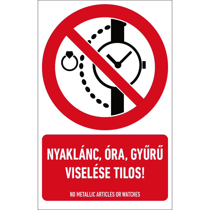 | Nyaklánc, óra, gyűrű viselése tilos! tábla (piktogram + felirat) 160x250 mm TIT049001PET01600250 | PET-G 0,7 mm+kétoldalas ragasztó | 160 mm | 250 mm | 1 mm | db | 1100 Ft | 1397 Ft |