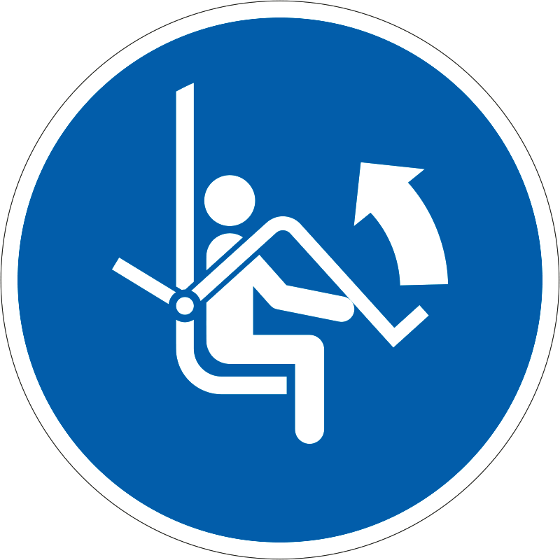 A “Nyissa fel a felvonó védőkorlátját!” a biztonság és egészség védelmére vonatkozik: a felvonó védőkorlátjának felnyitását előíró kék alapon fehér piktogram.