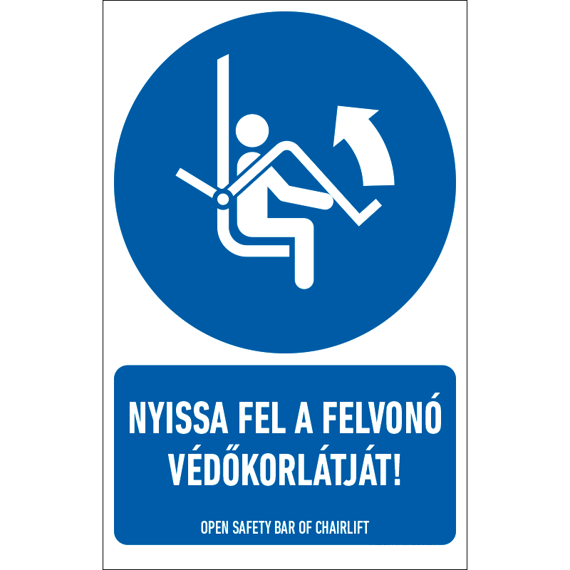 A “Nyissa fel a felvonó védőkorlátját!” a biztonság és egészség védelmére vonatkozik: a felvonó védőkorlátjának felnyitását előíró kék alapon fehér piktogram+felirat.