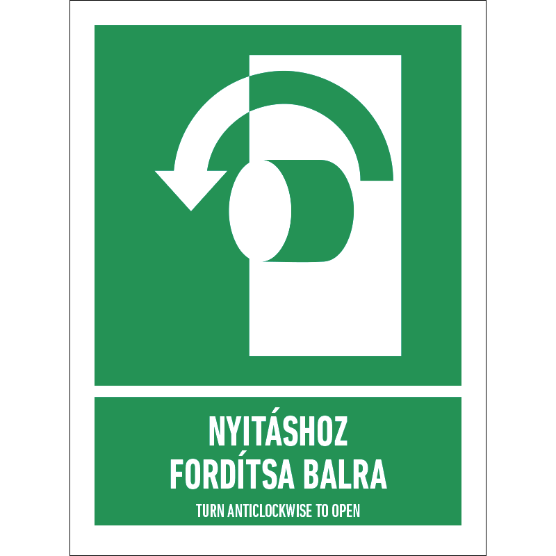 | Nyitáshoz fordítsa balra (óramutató járásával ellentétesen)! tábla (ISO 7010-E018 piktogram + felirat) 150x200 mm MET061002PVC01500200 | PVC 1 mm | 150 mm | 200 mm | 1 mm | db | 625 Ft | 794 Ft |