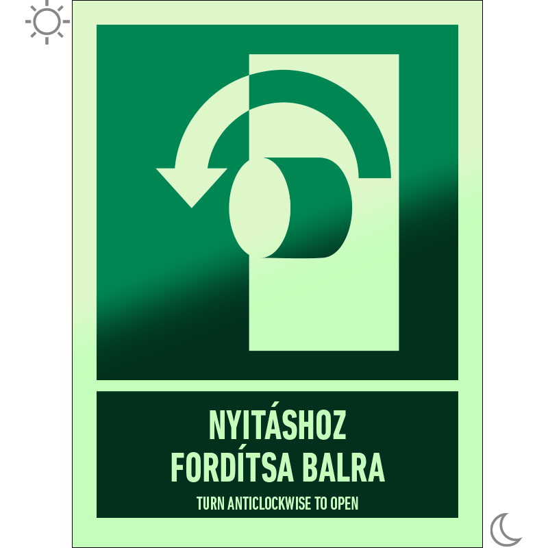 A “Nyitáshoz fordítsa balra” a zár nyitási irányát a sötétben utánvilágítva jelző zöld alapon fehér piktogram.