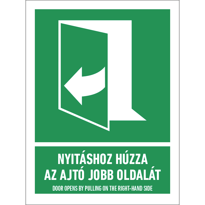 A “Nyitáshoz húzza az ajtó jobbl oldalát!” az ajtó nyitásának módját jelző zöld lapon fehér piktogram.