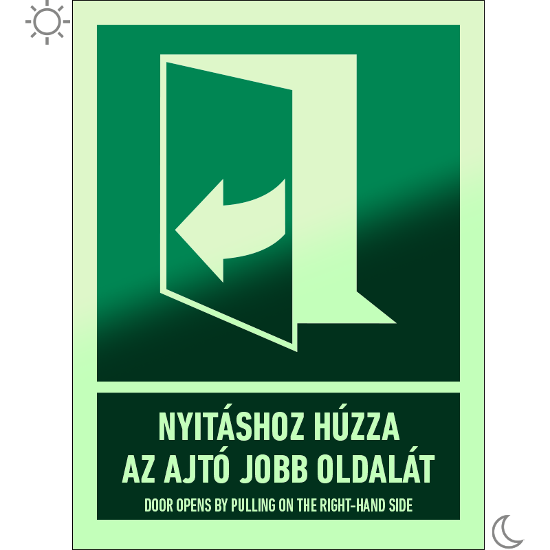 Nyitáshoz húzza az ajtó jobb oldalát! utánvilágító tábla (ISO 7010-E058 piktogram + felirat) 150x200 mm MET073002UTM01500200 utánvilágító PVC 150 mm 200 mm 1.1 mm db 1450 Ft 1842 Ft
