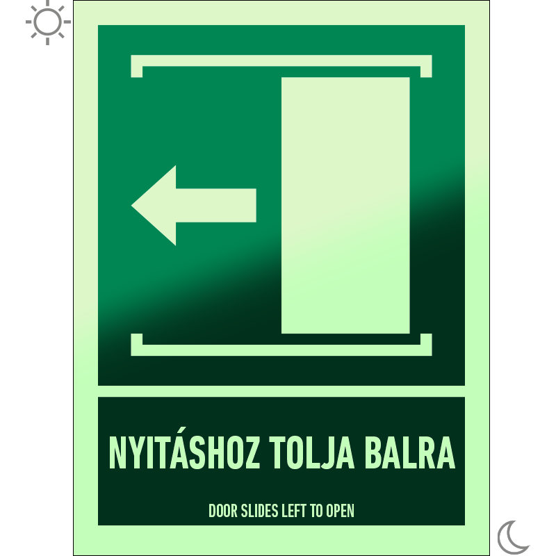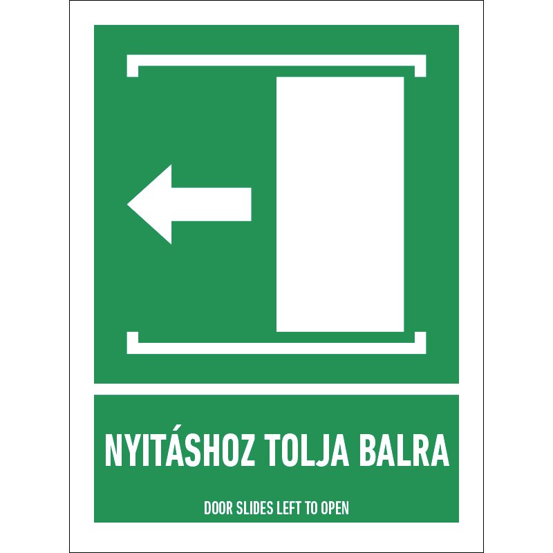 A “Nyitáshoz tolja balra!” az ajtó nyitásának módját jelző zöld lapon fehér piktogram.