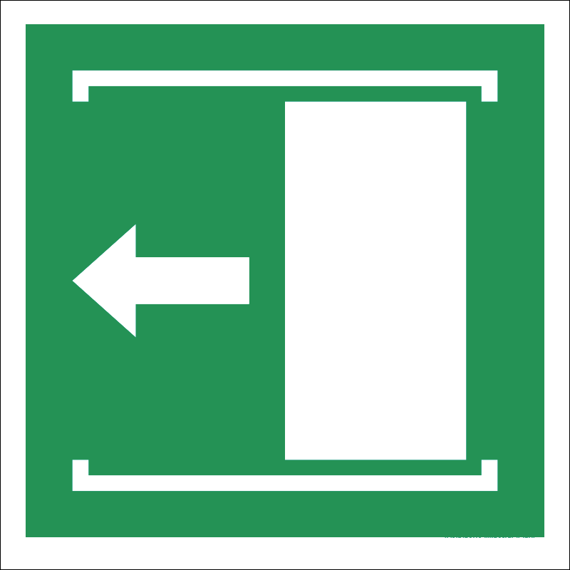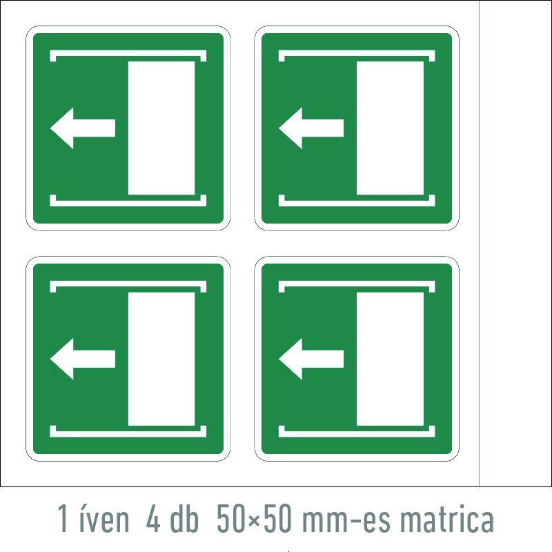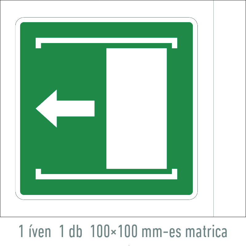 A “Nyitáshoz tolja balra!” az ajtó nyitásának módját jelző zöld lapon fehér piktogram.