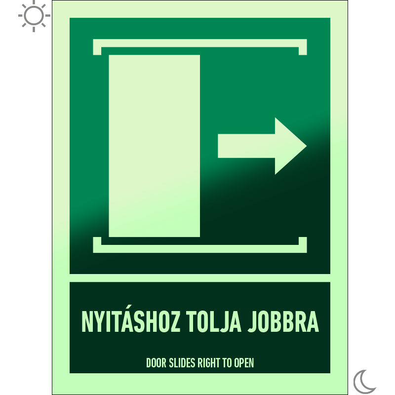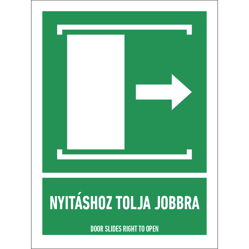 A “Nyitáshoz tolja jobbra!” az ajtó nyitásának módját jelző zöld lapon fehér piktogram.