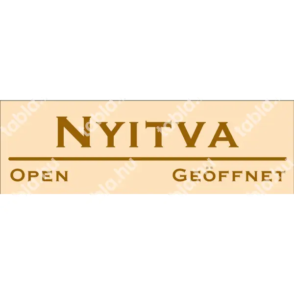 | Nyitva tábla (bézs/barna, három nyelvű) 250x80 mm UZT009001PVC02500080 | PVC 1 mm | 250 mm | 80 mm | 1 mm | db | 545 Ft | 692 Ft |
