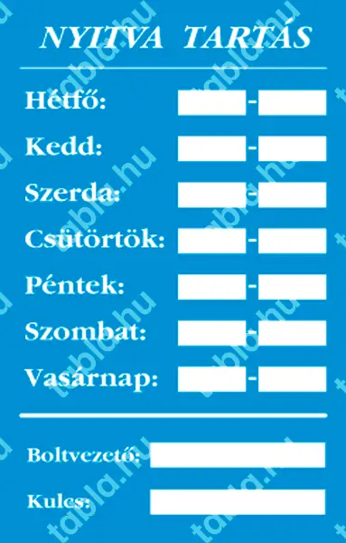 | Nyitvatartás tábla (kék/fehér, magyar nyelvű) 160x250 mm UZT015002PVC01600250 | PVC 1 mm | 160 mm | 250 mm | 1 mm | db | 825 Ft | 1048 Ft |