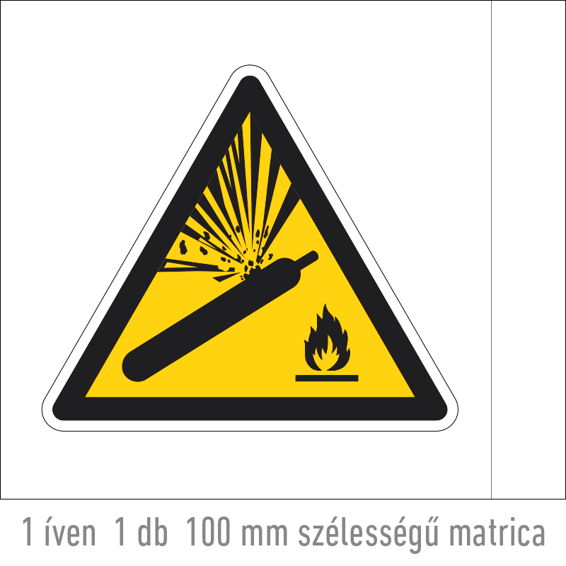 | Nyomás alatt álló gáztartály matrica (ISO 7010-W029 piktogram) 100 mm VET096000ONV01000000 | vinil öntapadó | 100 mm | 86 mm | 0.2 mm | db | 225 Ft | 286 Ft |
