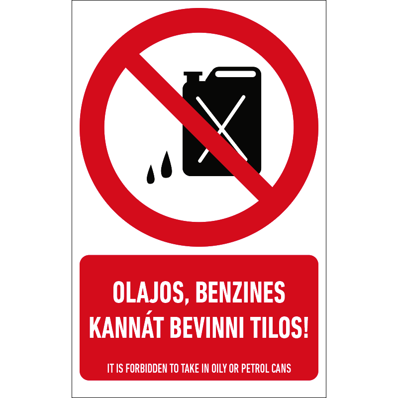Az “Olajos, benzines kannát bevinni tilos!” a helyiségbe olajos vagy benzines kanna bevitelét tiltó piktogram+felirat.