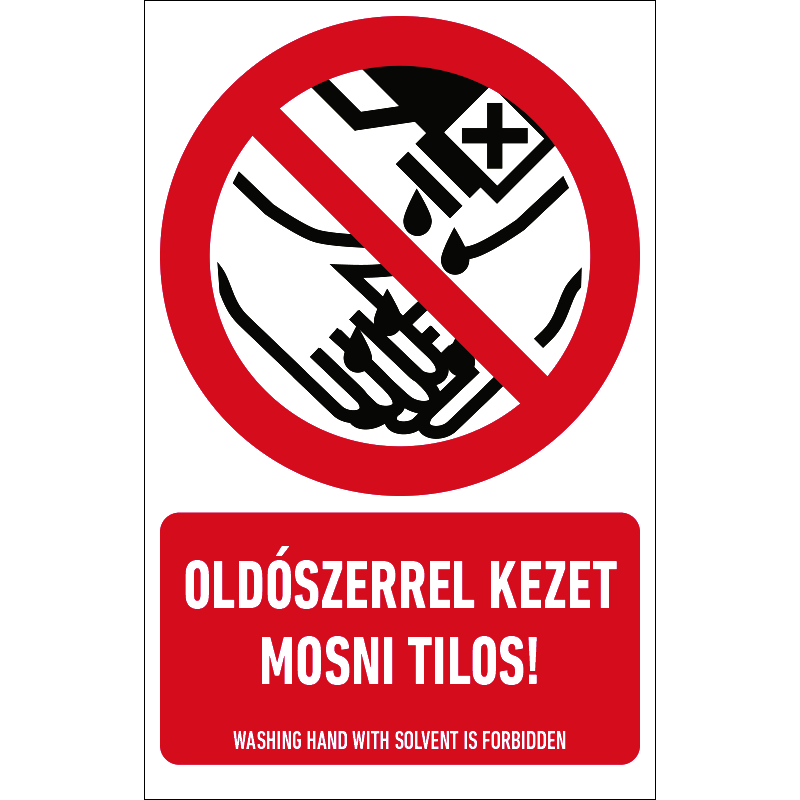 | Oldószerrel kezet mosni tilos! tábla (piktogram + felirat) 160x250 mm TIT019001PVC01600250 | PVC 1 mm | 160 mm | 250 mm | 1 mm | db | 825 Ft | 1048 Ft |