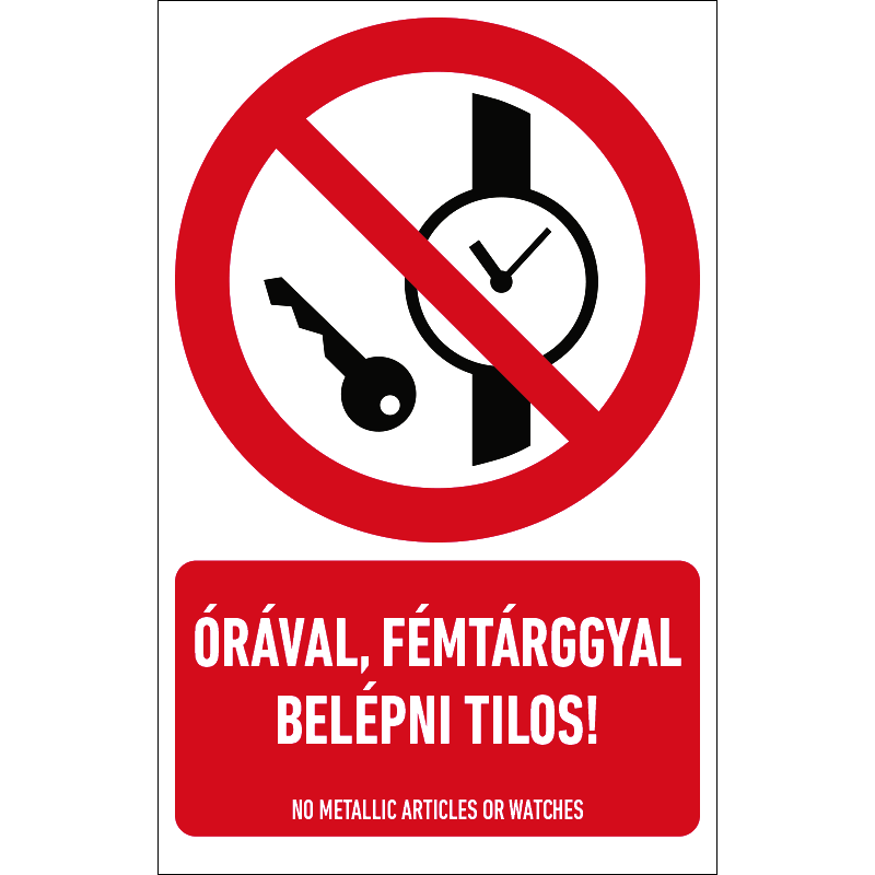 A “Órával, fémtárggyal belépni tilos!” az elektromágneses térbe fémtárgyat viselők belépését tiltó piktogram+felirat.