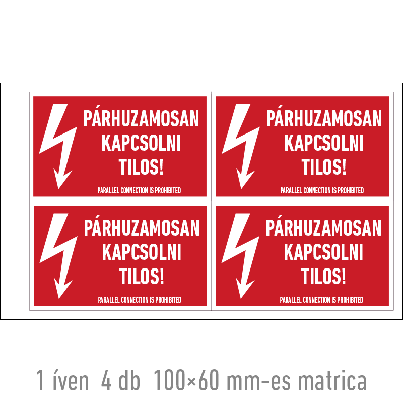 | Párhuzamosan kapcsolni tilos! matrica 100x60 mm ERV007001ONV01000060 | vinil öntapadó | 100 mm | 60 mm | 0.2 mm | ív | 275 Ft | 349 Ft |