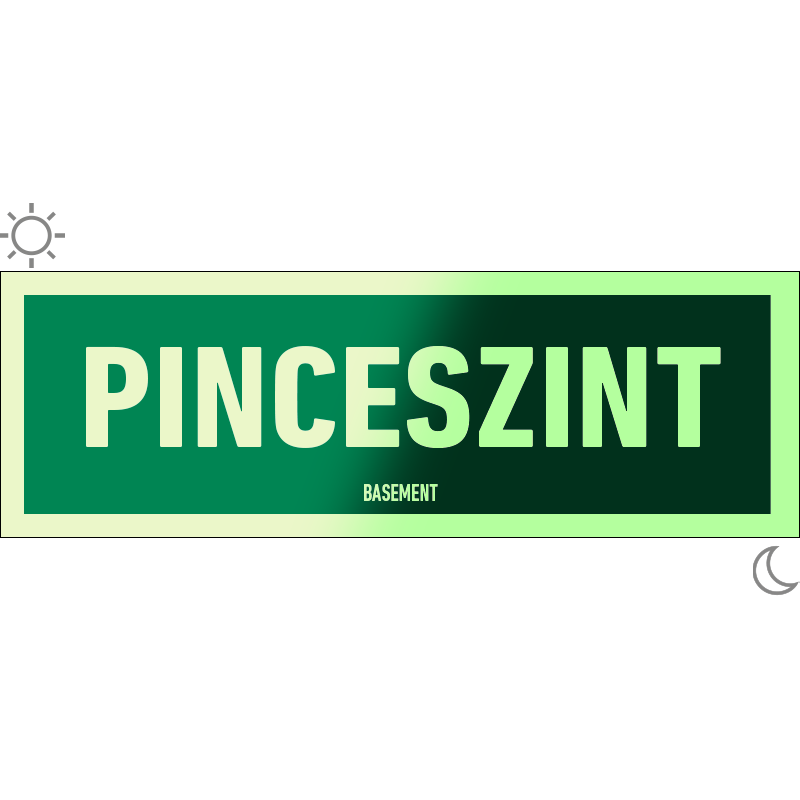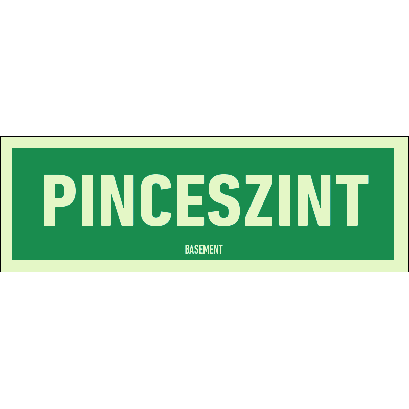 A “Pinceszint” a lépcsőház szintjét sötétben utánvilágítva jelző zöld alapon fehér felirat.