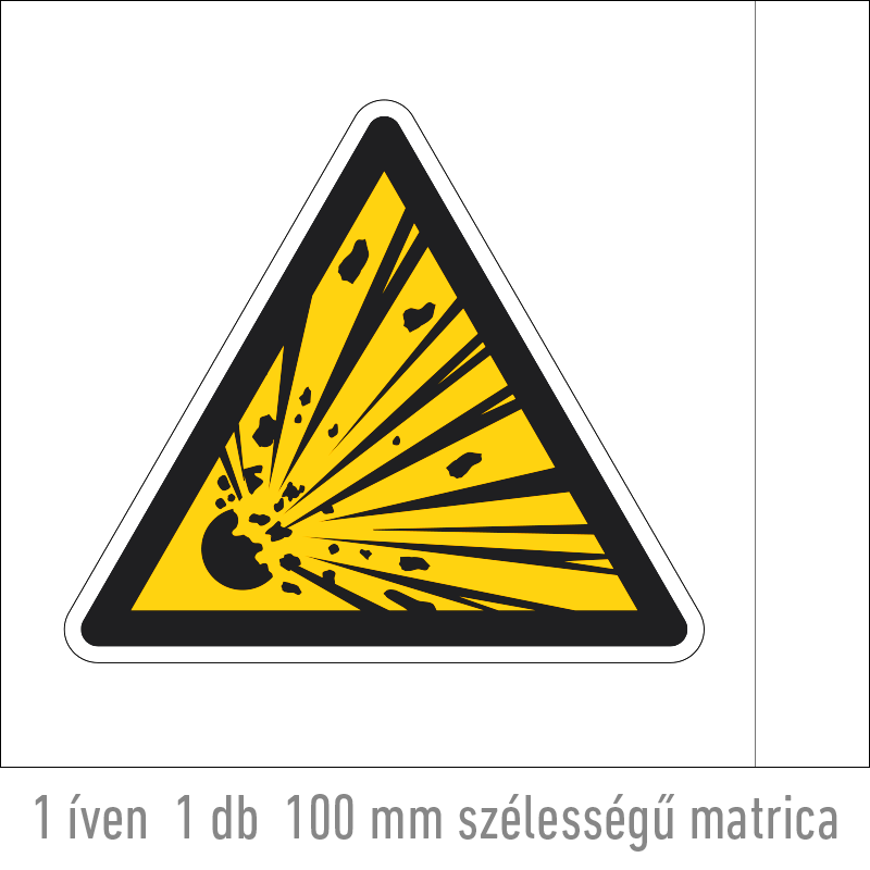| Robbanásveszélyes anyag! matrica (ISO 7010-W002 piktogram) 100 mm VET008000ONV01000000 | vinil öntapadó | 100 mm | 86 mm | 0.2 mm | db | 225 Ft | 286 Ft |
