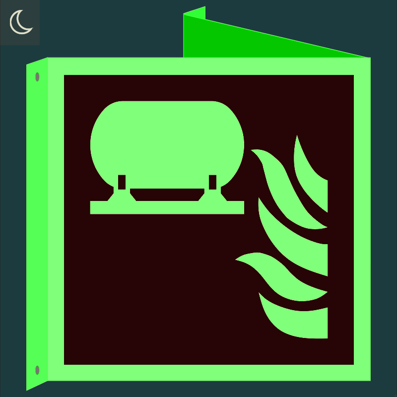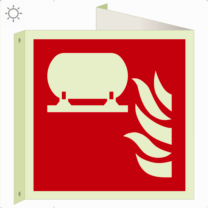 Rögzített tűzoltókészülék-berendezés utánvilágító tábla, faltól elálló, sátor alakú, kétoldalas (ISO 7010-F012 piktogram)