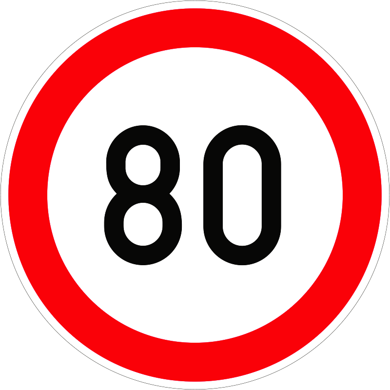 | Sebességkorlátozás 80 km/h KRESZ közlekedési tábla 750 mm (2. fóliaosztály) gyorsforgalmi út, főút, főútvonal KZC033011HHI00000750 | horganyzott lemez + fényvisszavető fólia HI | 750 mm | 750 mm | 1.99 mm | db | 27023 Ft | 34319 Ft |
