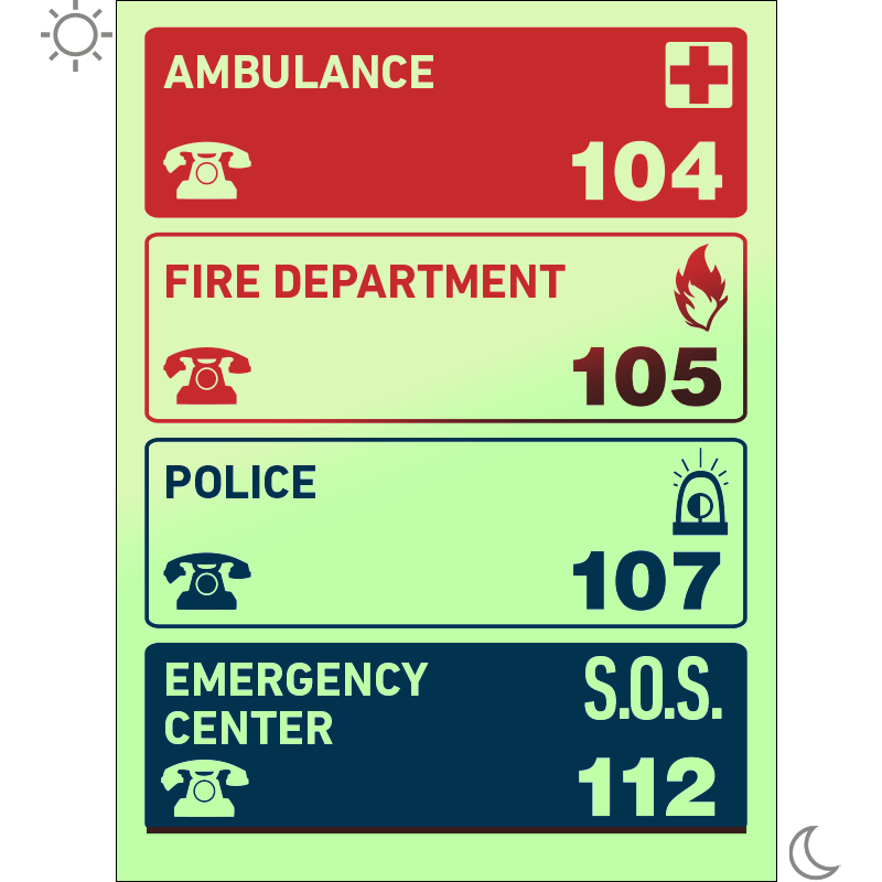 | Segélykérő telefonszámok utánvilágító tábla (piktogram + felirat) 150x200 mm TUT029003UTM01500200 | utánvilágító PVC | 150 mm | 200 mm | 1.1 mm | db | 1450 Ft | 1842 Ft |