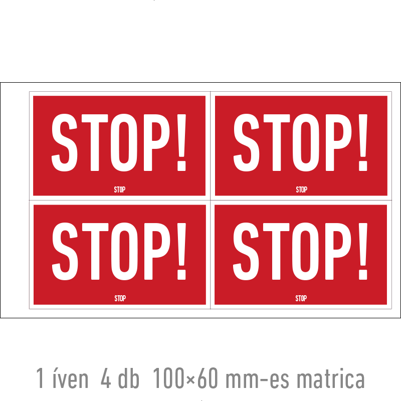| Stop! matrica 100x60 mm ERV061001ONV01000060 | vinil öntapadó | 100 mm | 60 mm | 0.2 mm | ív | 275 Ft | 349 Ft |