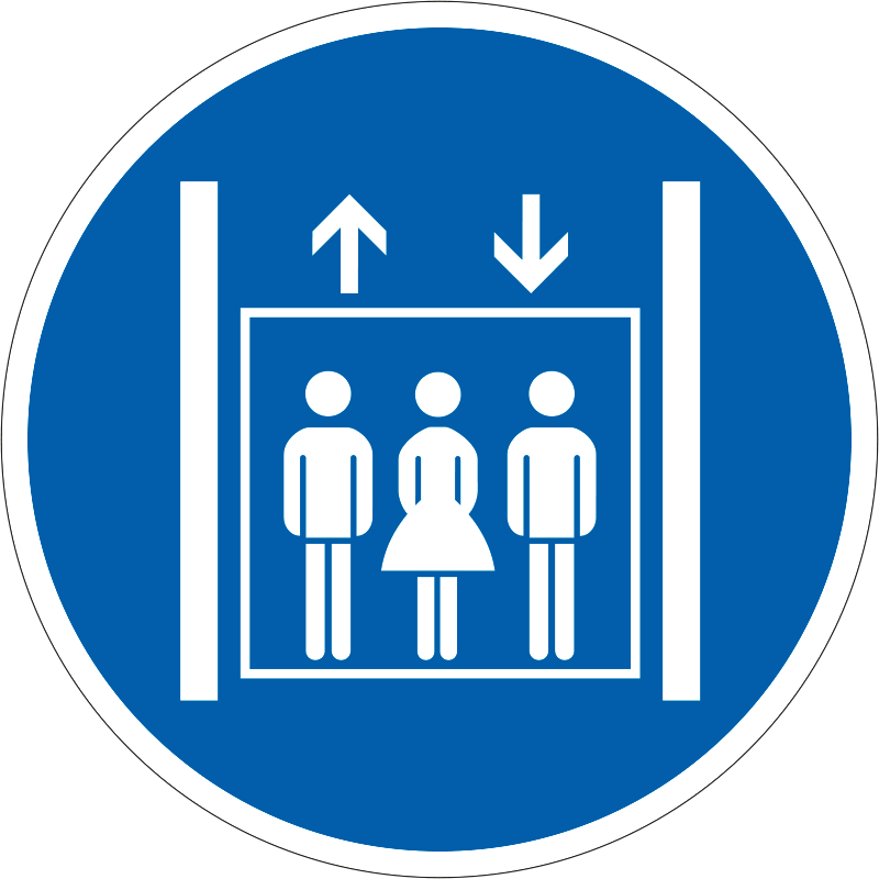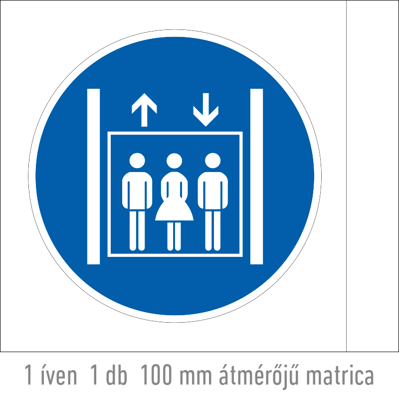 A “Személyfelvonó” a biztonság betartására vonatkozik: személyfelvonó használatát előíró kék alapon fehér piktogram.