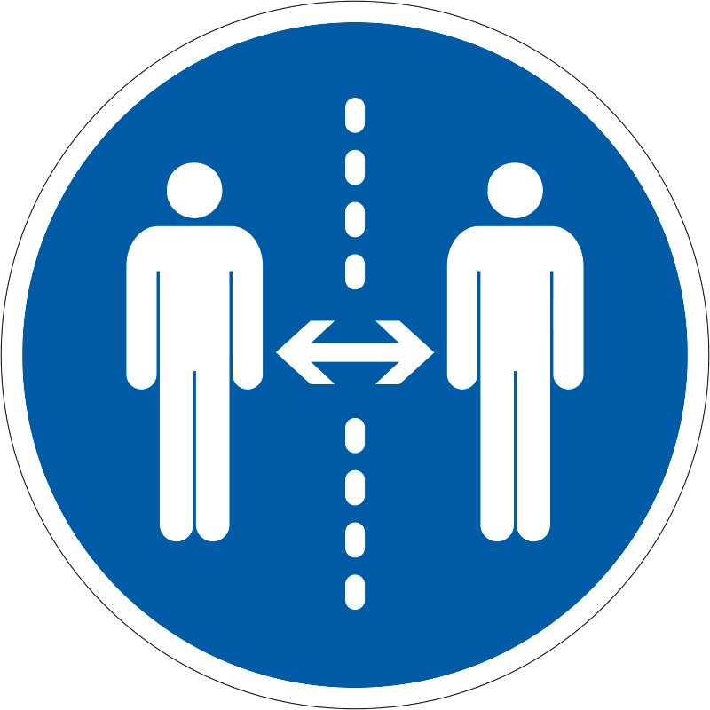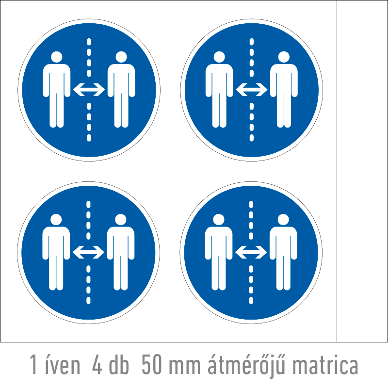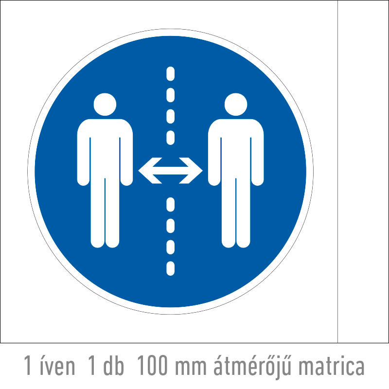 A “Tartsa be a 2 m-es távolságot!” a biztonság és egészség védelmére vonatkozik: a 2 m-es távolságot előíró kék alapon fehér piktogram.