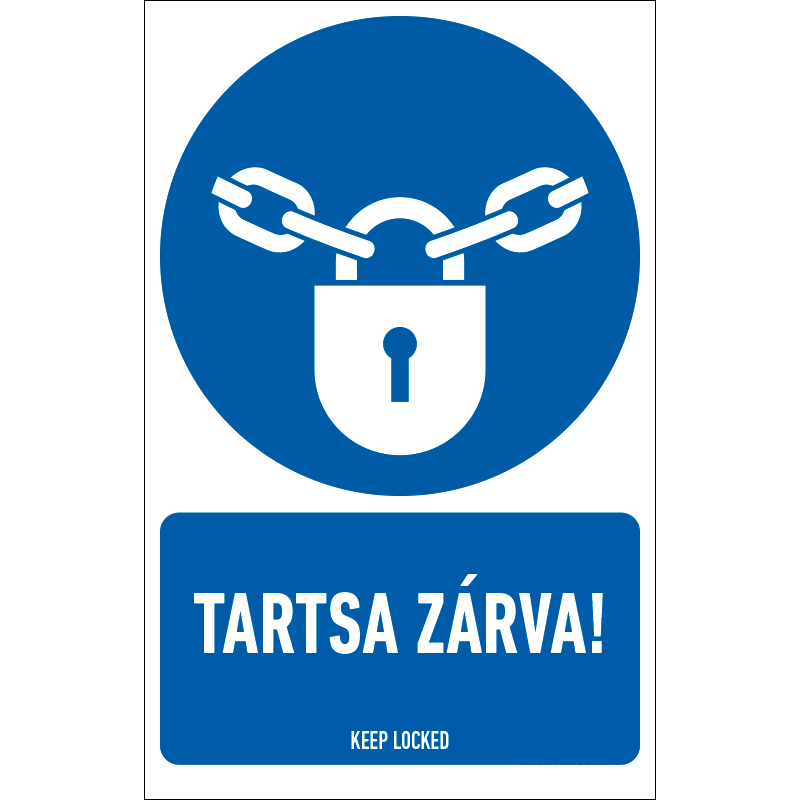 A “Tartsa zárva!” a biztonság védelmére vonatkozik: a terület zárva tartását előíró kék alapon fehér piktogram+felirat.