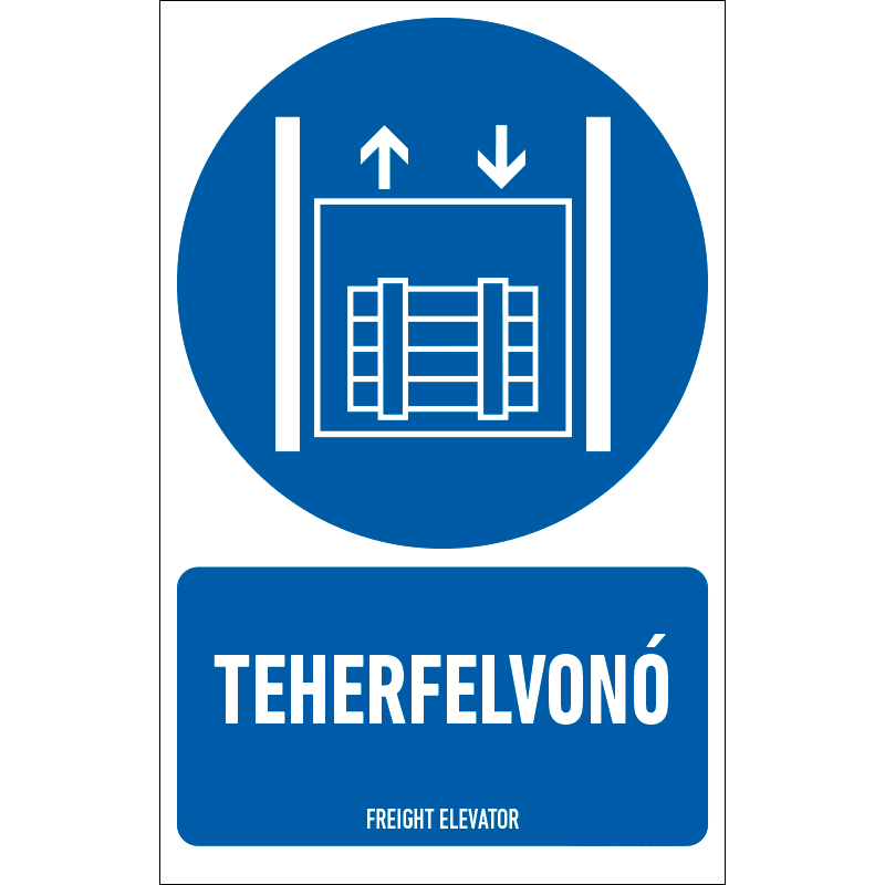 A “Teherfelvonó” a biztonság betartására vonatkozik: teherfelvonó használatát előíró kék alapon fehér piktogram+felirat.
