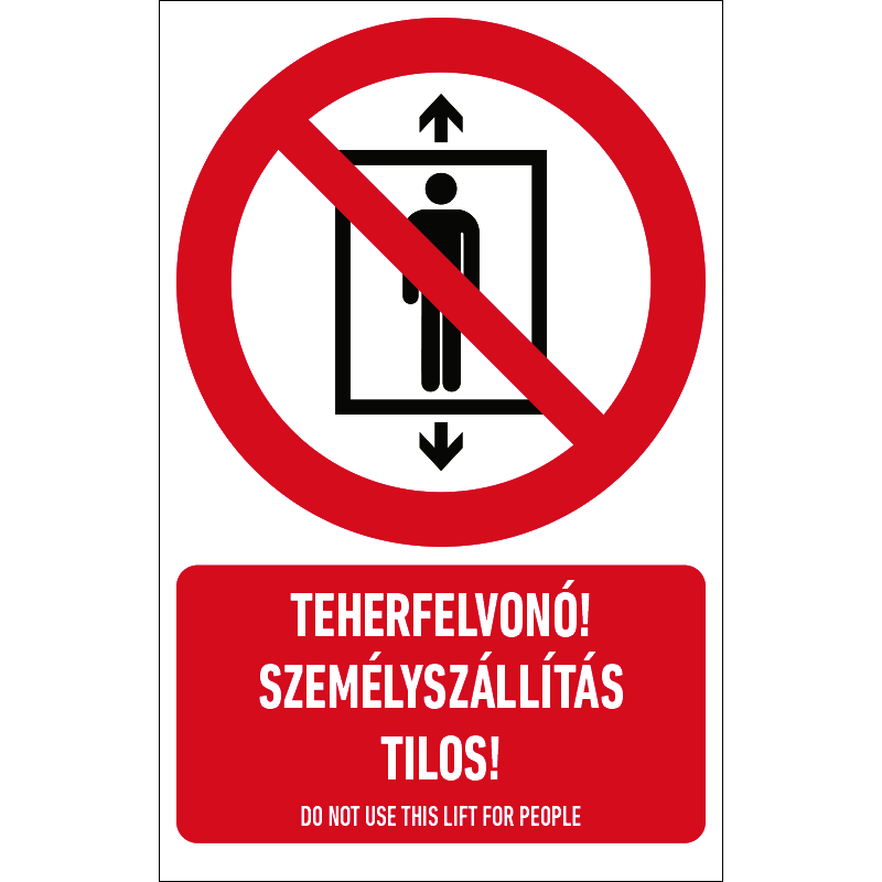 A “Teherfelvonó! Személyszállítás tilos!” a teherliftben a személyszállítást tiltó piktogram+felirat.