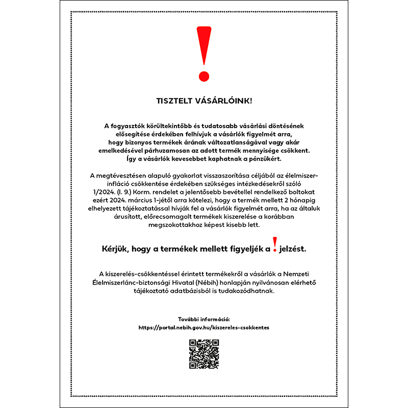Ez a matrica eleget tesz a Kormány 2024. március 1-től jogszabályban meghatározott viselkedésnek, mely szerint az 1 milliárd forint feletti árbevételű élelmiszer-kereskedőket arra kötelezi, hogy a termék mellett elhelyezett, figyelemfelhívó tájékoztatással hívják fel a vásárlók figyelmét, hogy az általuk árusított, előrecsomagolt termékek kiszerelése a korábban megszokottakhoz képest kisebb lett.