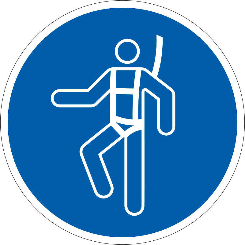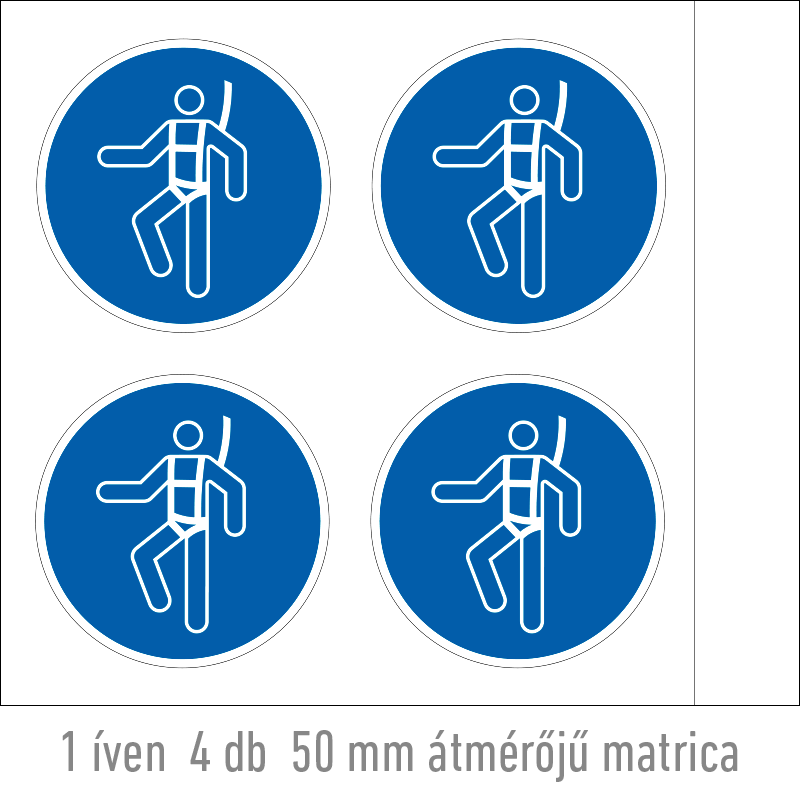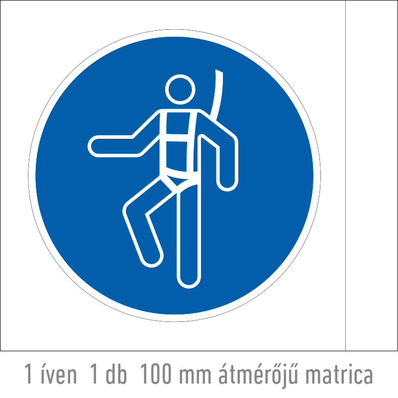 A “Testhevederzet használata kötelező!” a biztonság betartására vonatkozik: munkavédelmi testhevederzet használatát előíró kék alapon fehér piktogram.