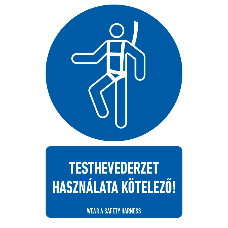 A “Testhevederzet használata kötelező!” a biztonság betartására vonatkozik: munkavédelmi testhevederzet használatát előíró kék alapon fehér piktogram+felirat.