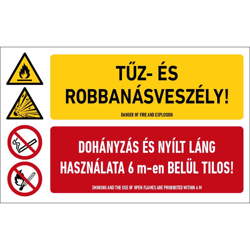 A “Tűz- és robbanásveszély! Dohányzás és nyílt láng használata 6 m-en belül tilos!” a tűz- és robbanásveszély miatt 6 méteren belül a dohányzást és nyílt láng használatát tiltó piktogram+felirat.