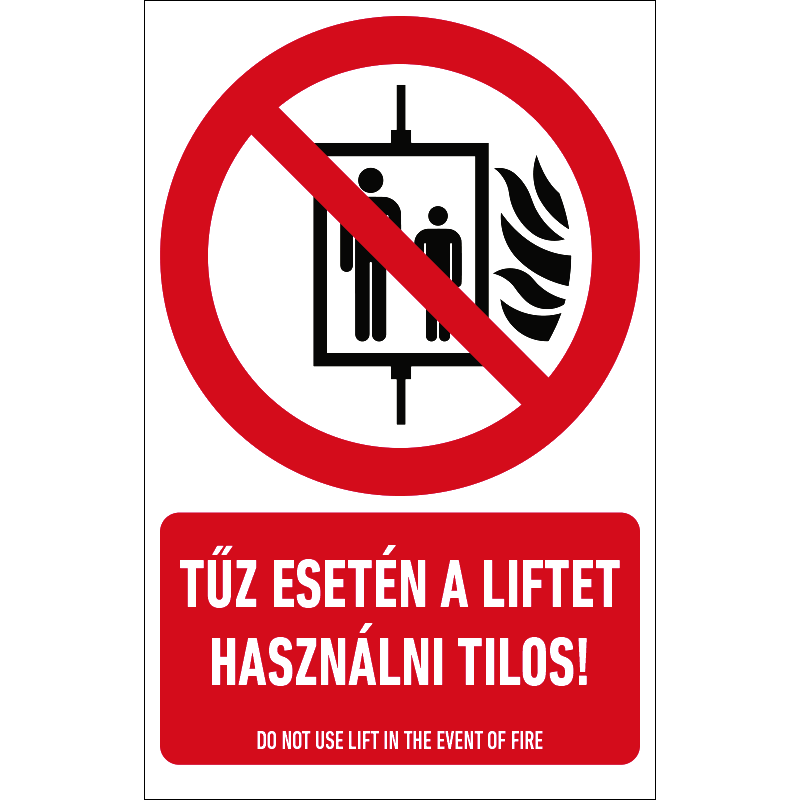 A “Tűz esetén a liftet használni tilos!” a lift használatát tűz esetén tiltó piktogram+felirat.