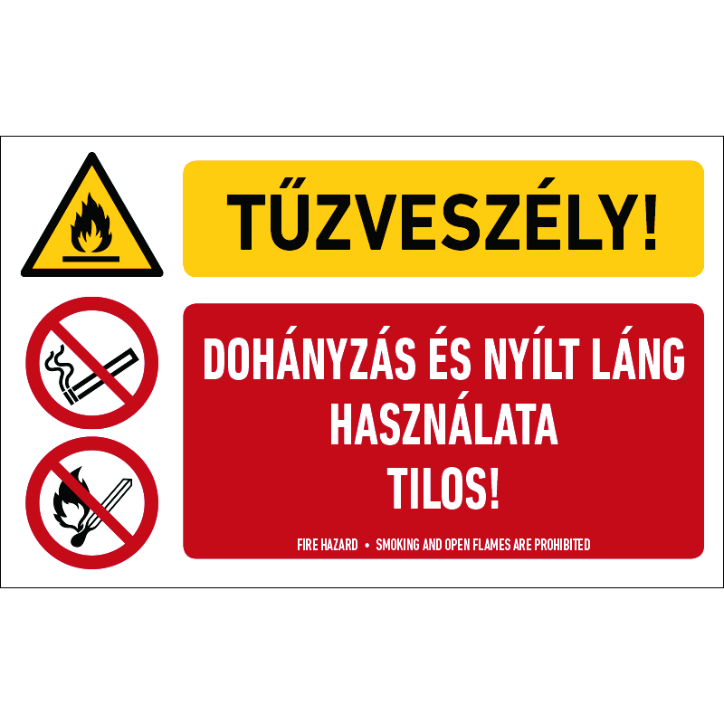 A “Tűzveszély! Dohányzás és nyílt láng használata tilos!” a tűzveszély miatt a dohányzást és nyílt láng használatát tiltó piktogram+felirat.
