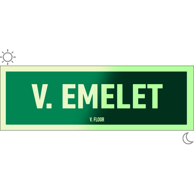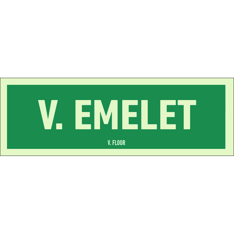 Az “V. emelet” a lépcsőház szintjét sötétben utánvilágítva jelző zöld alapon fehér felirat.