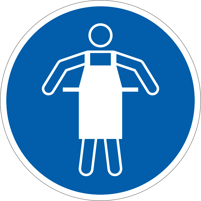 A “Védőkötény használata kötelező!” az egészség védelmére vonatkozik: munkavédelmi védőkötény használatát előíró kék alapon fehér piktogram.
