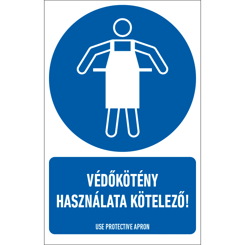A “Védőkötény használata kötelező!” az egészség védelmére vonatkozik: munkavédelmi védőkötény használatát előíró kék alapon fehér piktogram+felirat.
