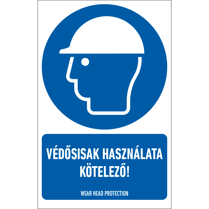 A “Védősisak használata kötelező!” a fej védelmére vonatkozik: munkavédelmi védősisak használatát előíró kék alapon fehér piktogram+felirat.