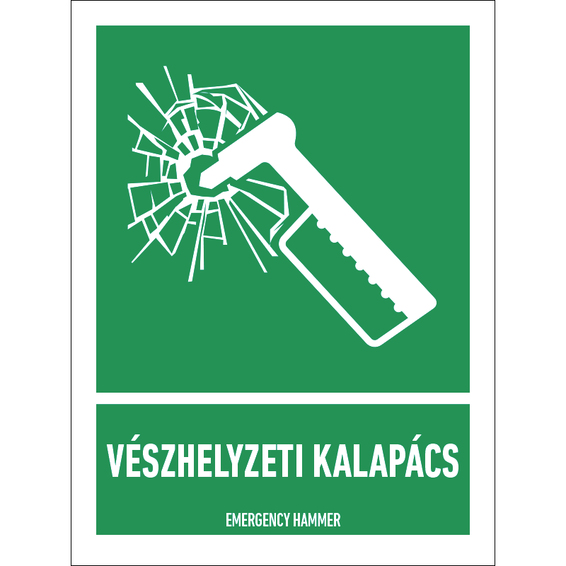 A “Vészhelyzeti kalapács” a vészhelyzeti kalapács helyét jelző zöld alapon fehér piktogram.