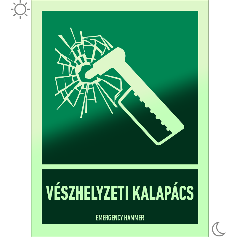 | Vészhelyzeti kalapács utánvilágító tábla (ISO 7010-E025 piktogram + felirat) 150x200 mm MET076002UTM01500200 | utánvilágító PVC | 150 mm | 200 mm | 1.1 mm | db | 1450 Ft | 1842 Ft |