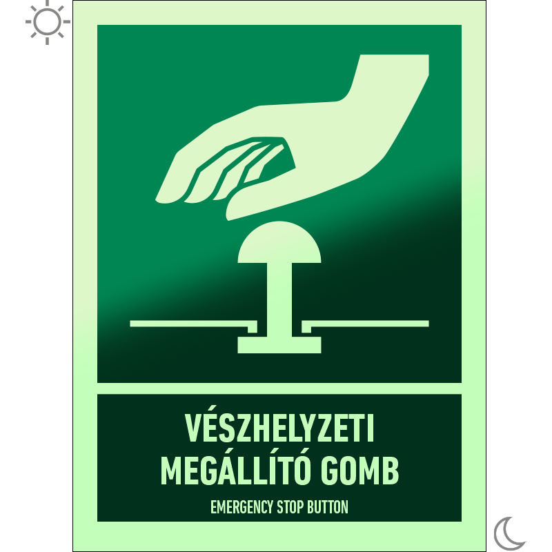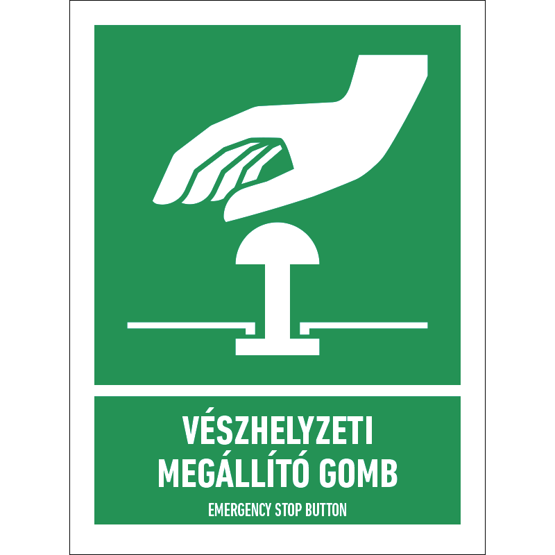 A “Vészhelyzeti megállító gomb” a vészhelyzeti megállító gomb helyét jelző zöld lapon fehér piktogram.