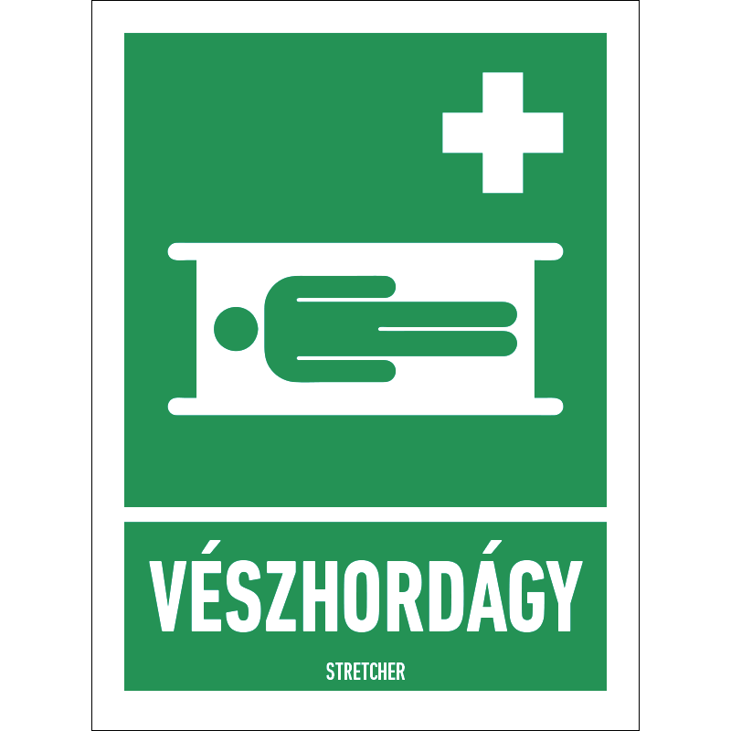 A “Vészhordágy” a vészhordágy tárolási helyét jelző zöld alapon fehér piktogram.