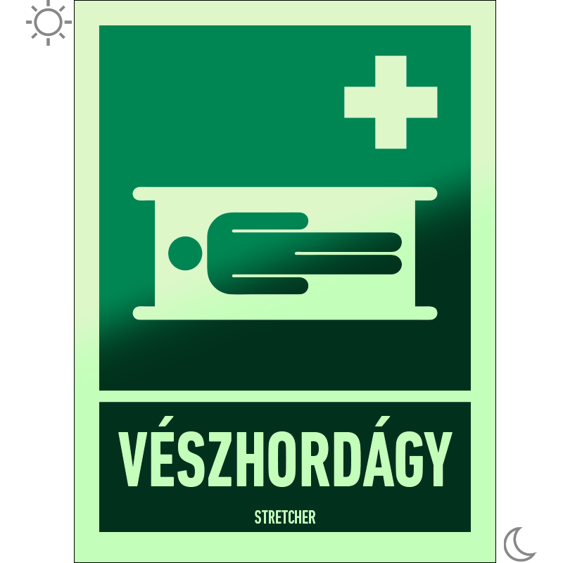 Vészhordágy utánvilágító tábla (ISO 7010-E013 piktogram + felirat) 150x200 mm MET011002UTM01500200 utánvilágító PVC 150 mm 200 mm 1.1 mm db 1450 Ft 1842 Ft