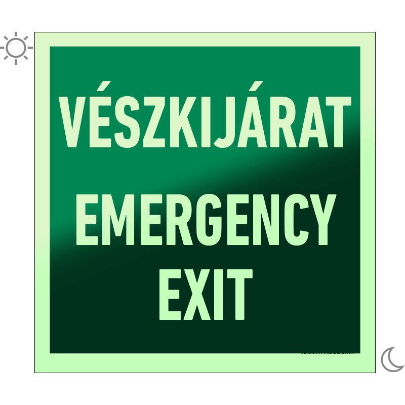 A “Vészkijárat – Emergency exit” a vészkijárat helyét jelző zöld alapon fehér magyar és angol nyelvű felirat.